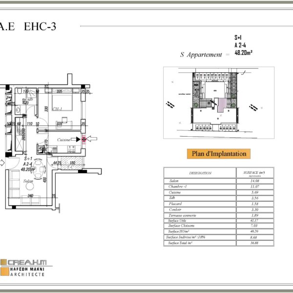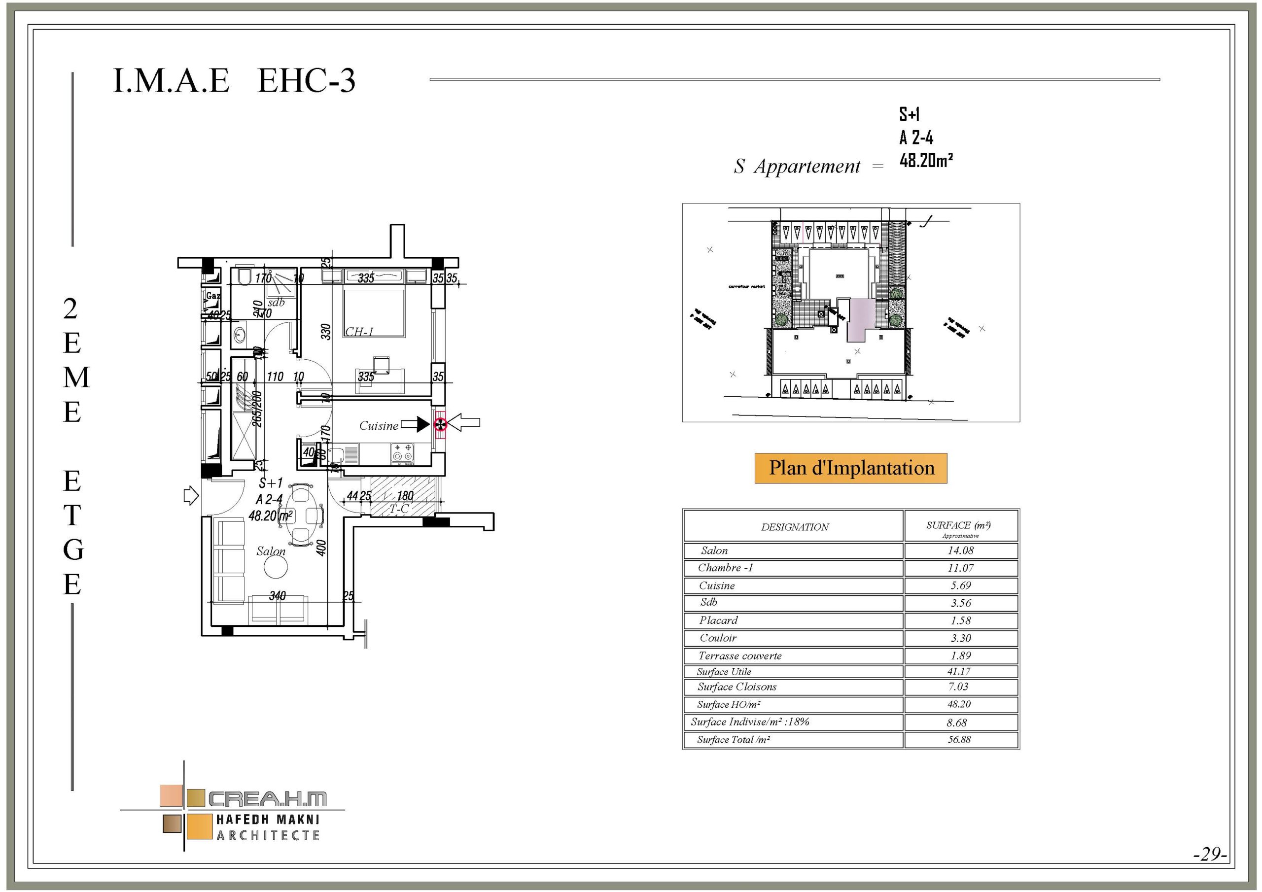 Cet appartement spacieux situé à EL MOUROUJ VI, offre un cadre idéal pour une vie confortable. Avec une surface total 56.88 m², cet appartement comprend un salon accueillant, une chambre à coucher (Chambre -1 ), une cuisine fonctionnelle, une salle de bains moderne, un espace buanderie (séchoir) et une terrasse couverte pour profiter de moments de détente.